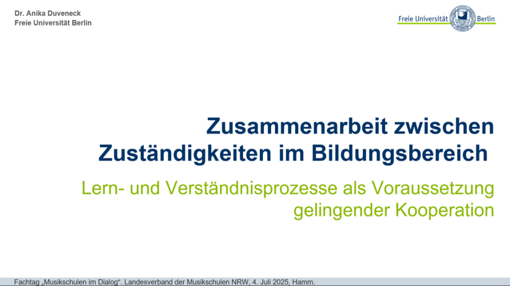 Kooperation und Zusammenarbeit sind auch im Bereich der Musikschulen ein Thema von zunehmender Bedeutung. Daher führte der Landesverband der Musikschulen in NRW (LVdM e.V.) am 4. Juli 2025 einen Fachtag zum Thema „Musikschule im Dialog. Erfolgreiche Zusammenarbeit für musikalische Bildung“ durch. Die Veranstaltung begann mit einem Input von Dr. Anika Duveneck, die digital in die Musikschule Hamm dazugeschaltet wurde.